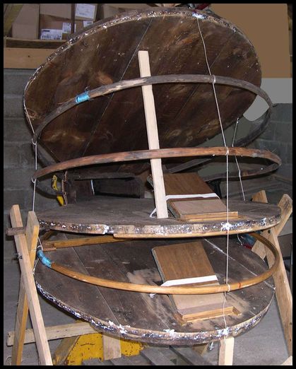Après réparation de deux arceaux et fabrication du troisième, il a fallu les fixer avec des bandelettes de cuir et les centrer sur le cadre en bois. Les deux soupapes qui avaient disparu, ont été refaites puis remises en place.