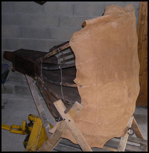 Pour couvrir l'ensemble du soufflet il fallait un morceau de cuir de 3 mètres de long. Donc on a été obligé de le réaliser en trois pièces. Le plus difficile est la partie arrière du fait de sa double courbure. Enfin cette pièce de cuir a pris sa forme et le soufflet va être prêt pour recevoir les deux éléments latéraux qui seront collés et cousus.