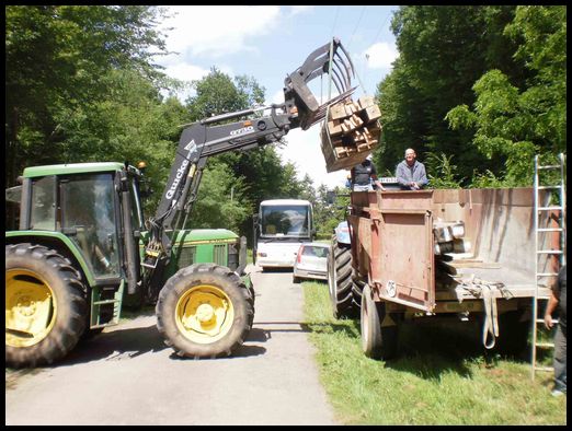 Déchargement des poutres de chênes qui nous ont été offertes par la société Mouffron et fils.