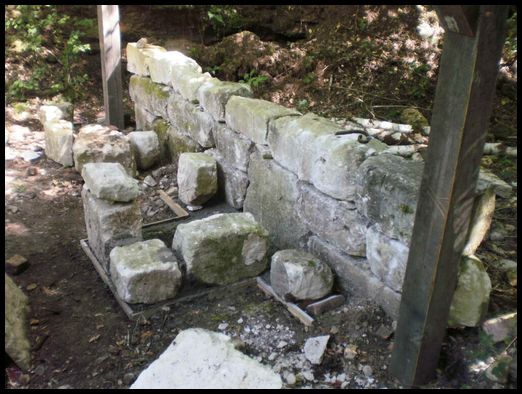 Début de la construction du foyer de la forge (les pierres blanche et les briques proviennent des ruines du château de Tannerre qui a brulé en 1978).
